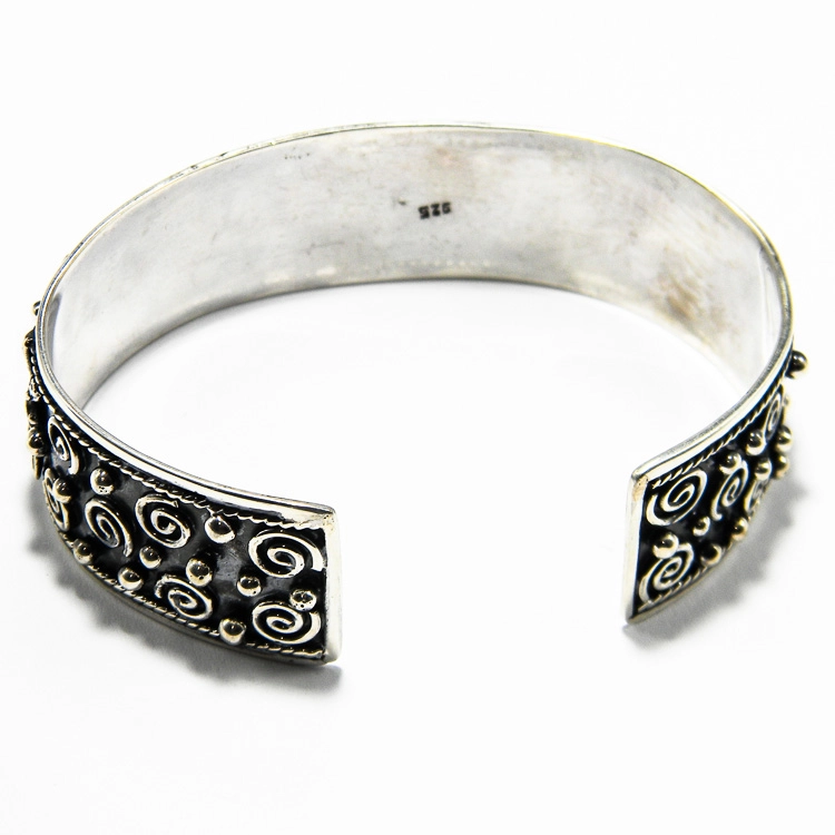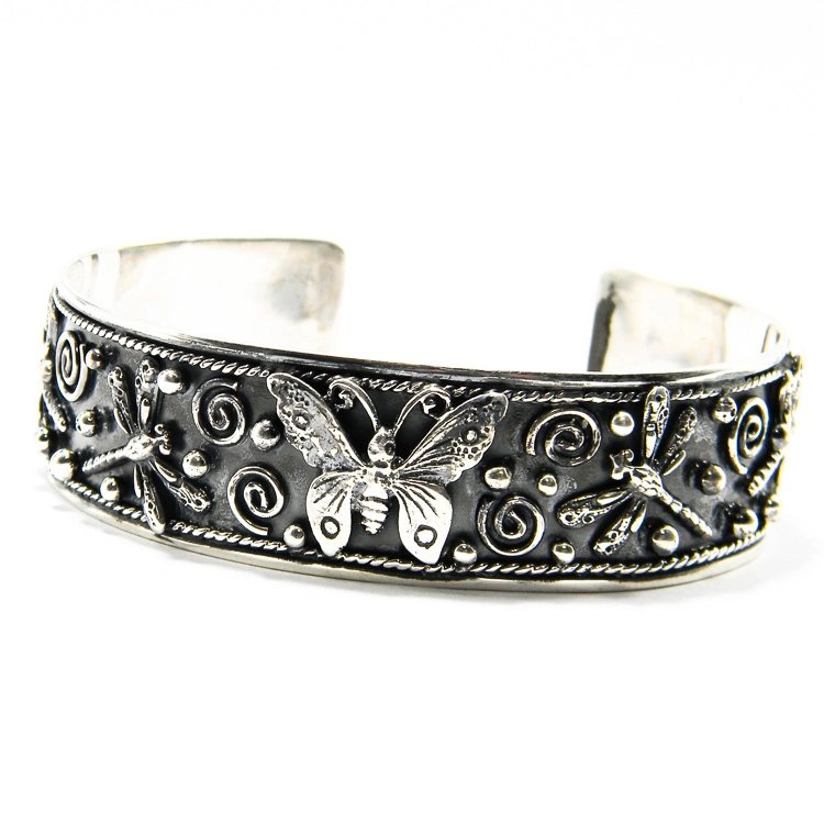 Brățară din argint cu fluturi și libelule în stil vintage Art Nouveau – brățară fixă masivă, cu decorațiuni elaborate și design în relief. Structura elastică îi permite să se așeze cu ușurintă pe încheietură. O bijuterie unicat rezistentă, cu design elegant, potrivită pentru orice ținută.