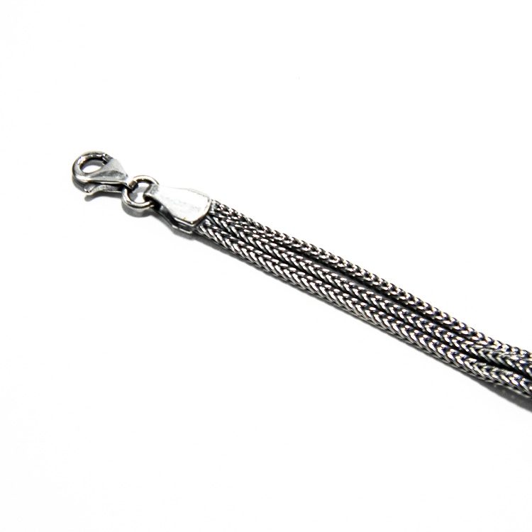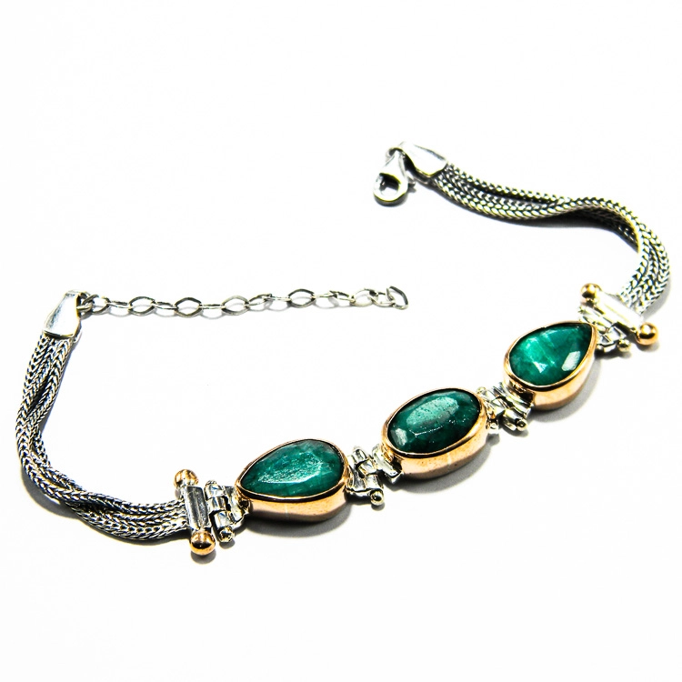 Această brățară din argint cu smarald de sinteză, realizată în stil vintage cu infuențe bizantine, are ca piese principale cele trei pietre mari de smarald de sinteză, cu o nuanță plăcută de verde-crud, prinse în rame din argint tratat cu bronz, pentru a accentua aspectul de bijuterie vintage. Cele trei pietre sunt susținute de două segmente de lanț din argint antichizat, dispuse pe trei rânduri, de fiecare parte a pietrelor de smarald, cu o lățime totală de 0.5 cm. O brățară elegantă și elaborată, lucrată cu mare atenție la detalii, specifică stilului vintage bizantin.