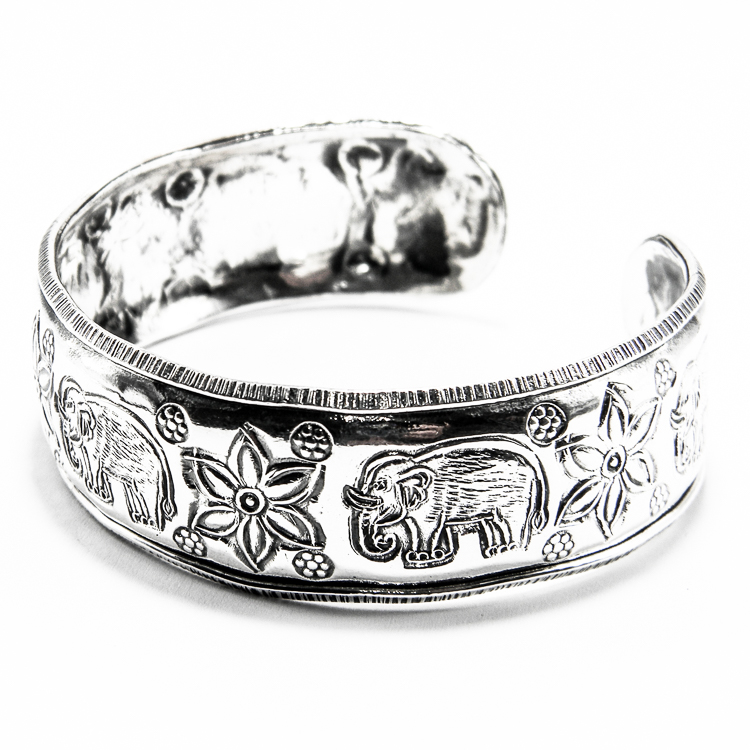 Bratara fixa din argint 925, in stil Art Deco, cu gravura de elefanti si flori.