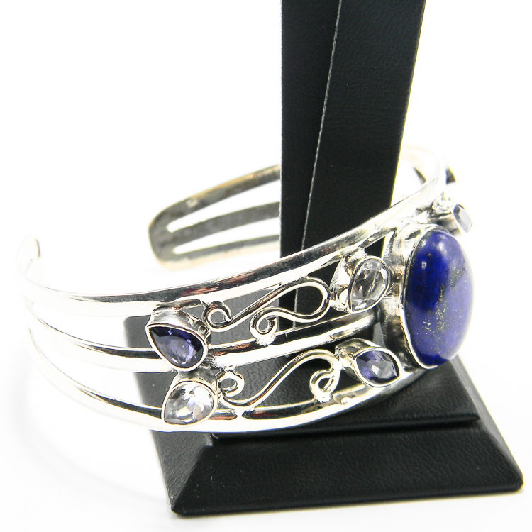 Bratara fixa unicat din argint 925, in stil vintage oriental, decorata cu piatra mare de lapis lazuli, si pietre fatetate de ametist si cristal de stanca, in forma de lacrima.