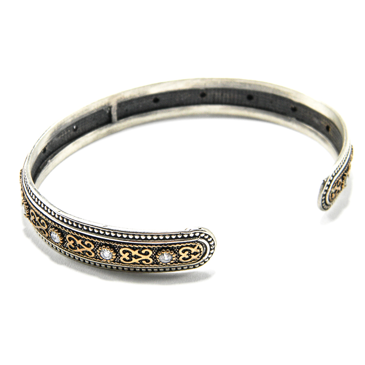 Bratara fixa semideschisa, in stil bizantin din argint 925 antichizat, decorata cu pietre zirconiu, si partial tratara cu bronz.