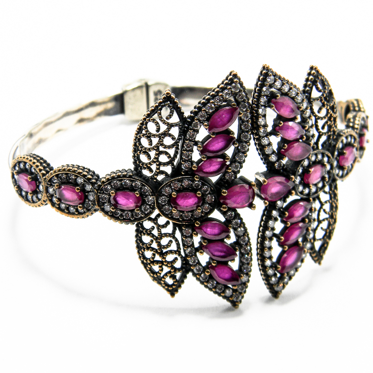 Bratara fixa din argint 925, in forma de fluturi stilizati, decorata cu radacina de rubin si pietre zirconiu – model vintigi unicat, stil oriental.
