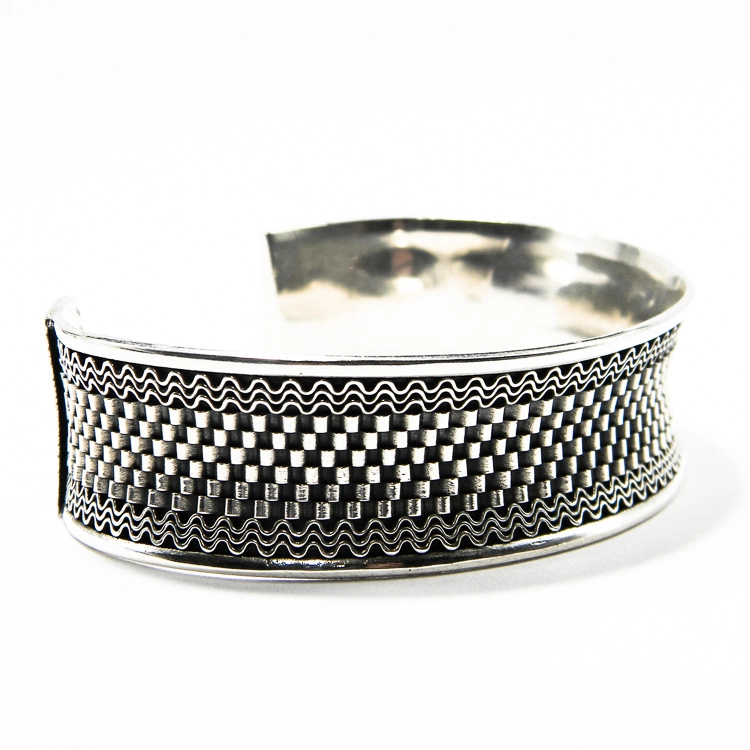 Bratara fixa din argint patinat, cu structura deschisa, la confluenta stilurilor Art Deco si Etno.