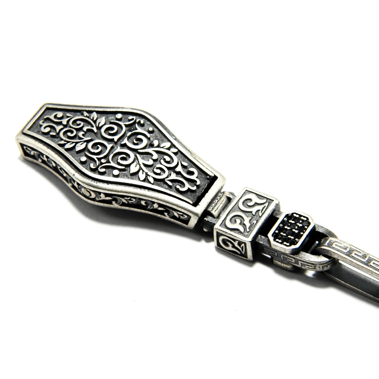 Aceasta bratara unicat atrage nu doar prin aspectul sau puternic si asumat, ci si prin ingeniozitatea artizanului. Aici, argintul antichizat si zirconiile negre stralucitoare se incadreaza perfect in ansamblu, iar elementul central, curbat si bogat ornamentat, devine punctul de atractie al acestei piesei . Sistemul de inchidete, situat la unul din capetele elementului central , este discret si ascuns: prin apasare sau impingere, aceasta bijuterie unicat se inchide si se deschide.