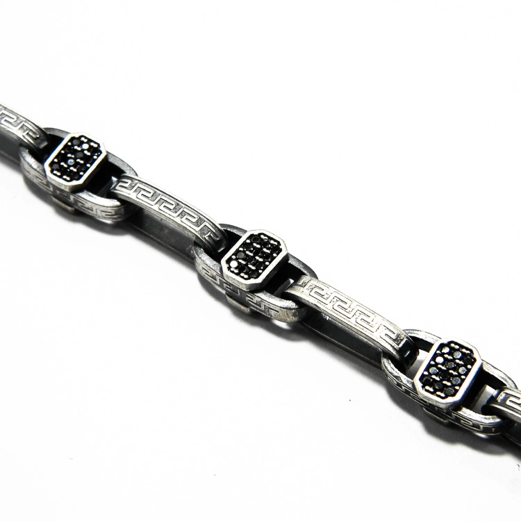 Bratara statement vintage din argint – Unicat – bijuterie de autor – cu elemente articulate decorate cu motive grecesti si zirconii negre. Elementul central, curbat si borat ornamentat, devine punctul de atractie al acestei bratara. Argintul antichizat utilizat se incadreaza perfect in ansamblu.