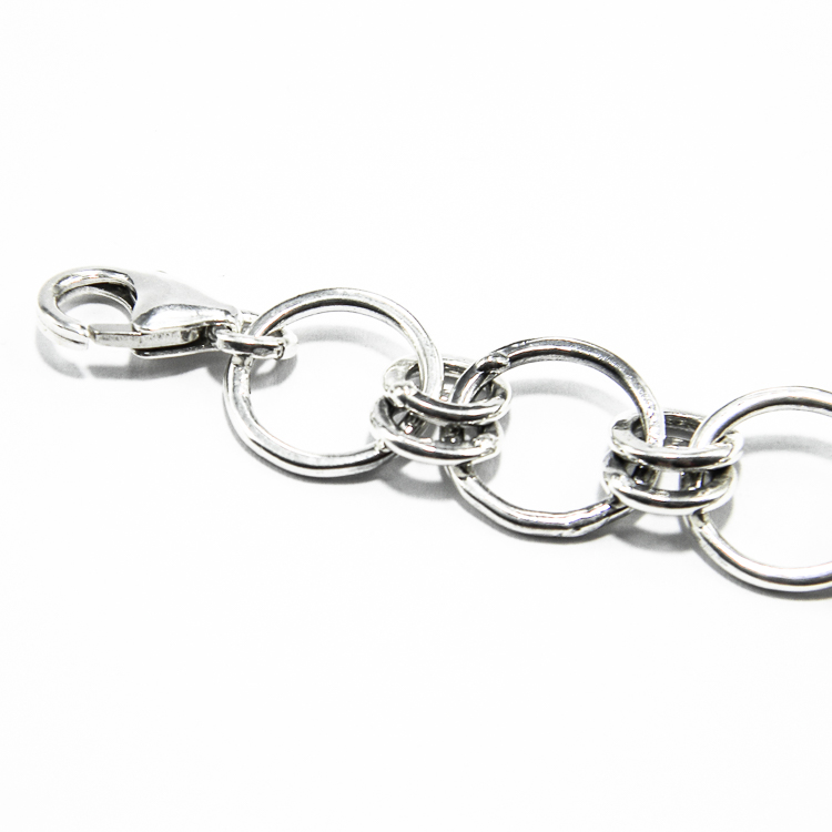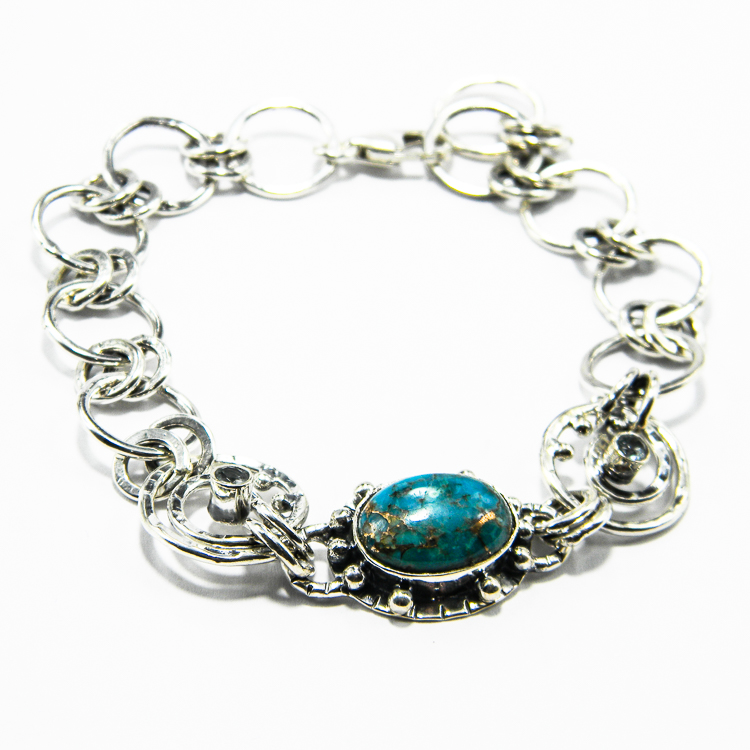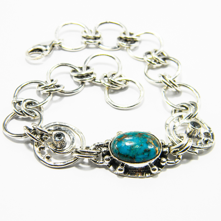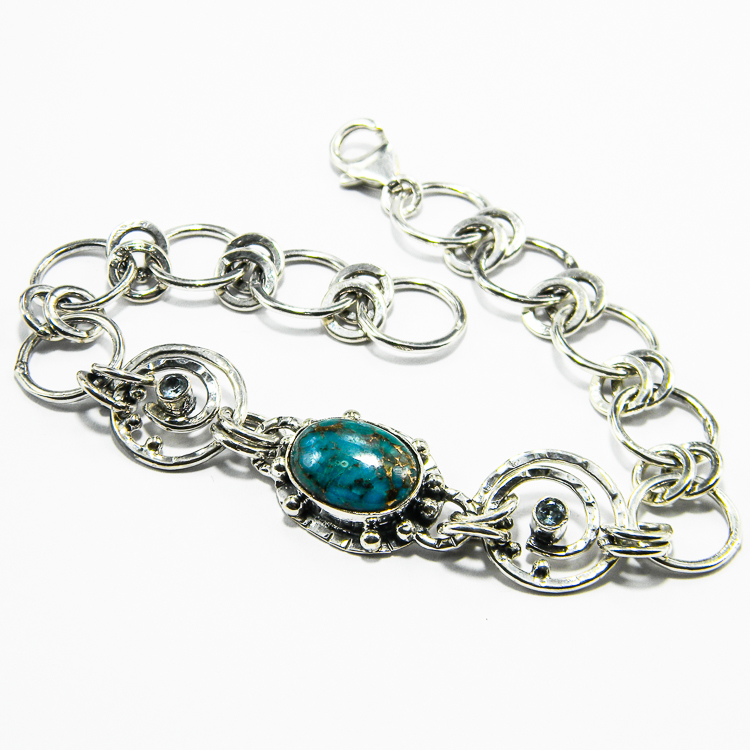 Bijuterii argint unicat – Bratara din argint 925, in stil ArtDeco, formata din zale mari rotunde, si decorata cu turcoaz natural si pietre de acvamarin.