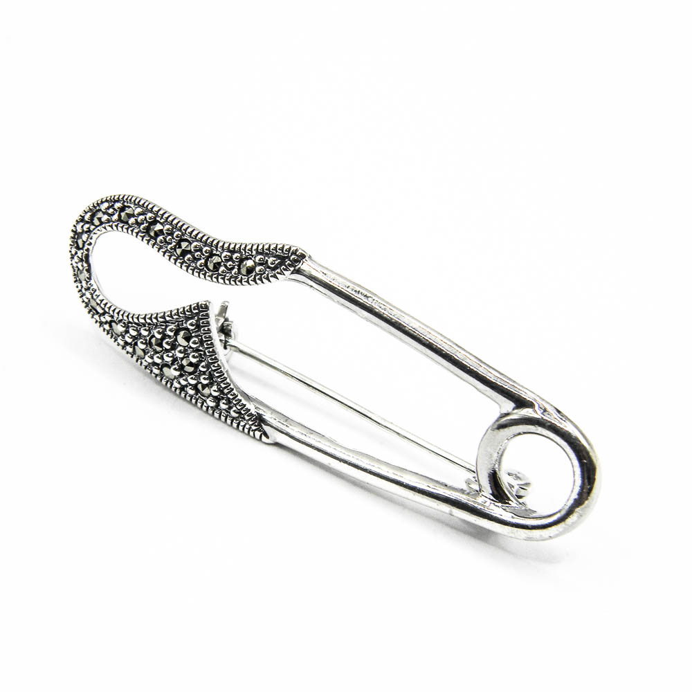 Bijuterii argint cu marcasite – Brosa stil vintage, in forma de agrafa, din argint 925, decorata partial cu marcasite.