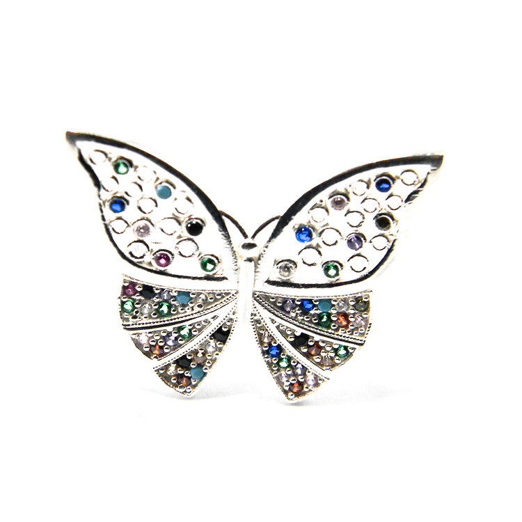 Brosa in stil filigram, model Fluture, din argint 925, decorat partial cu pietre zirconiu in culori pastelate.