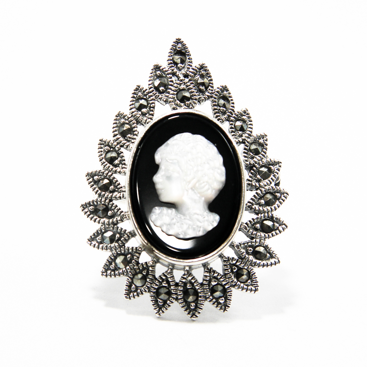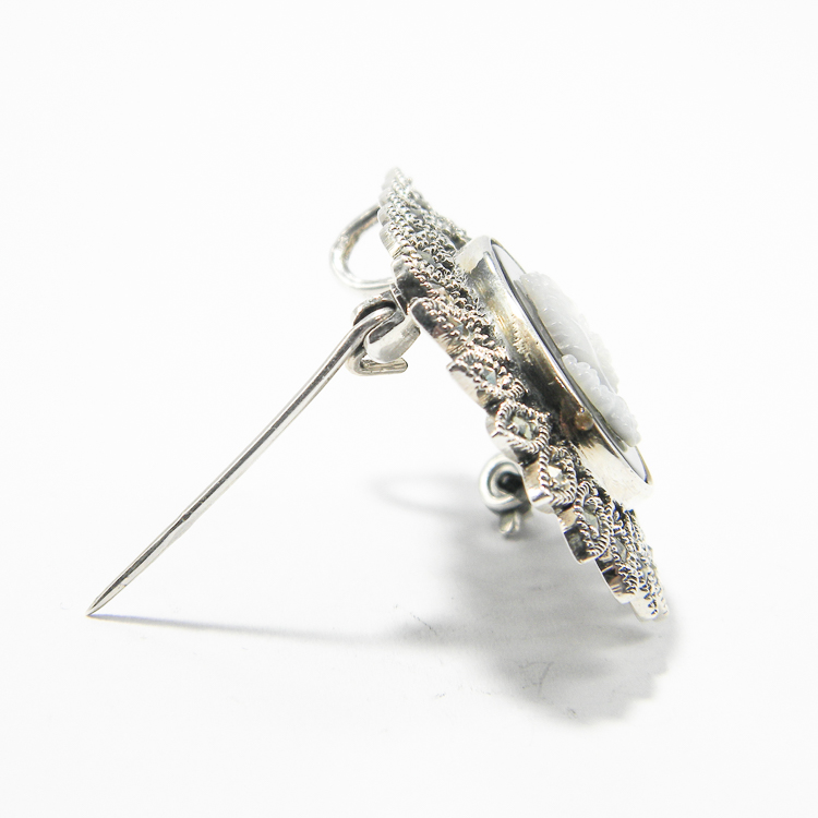 Brosa argint stil vintage – model Camee – din argint 925, decorata cu marcasite si sidef alb.