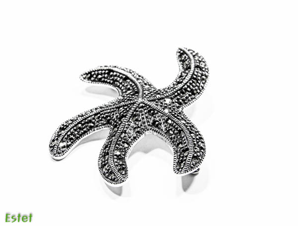 Brosa mare, in forma de stea de mare, din argint 925, decorata in intregime cu marcasite.