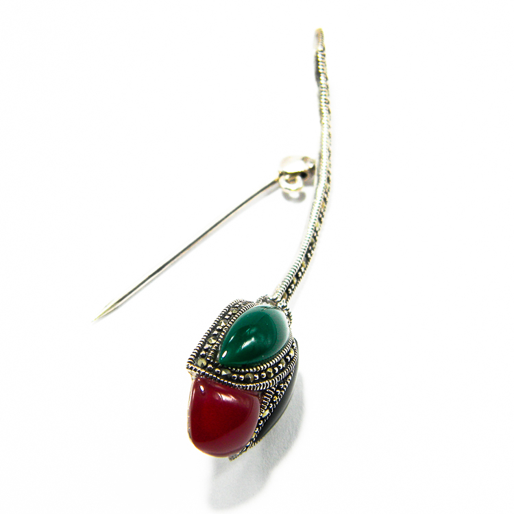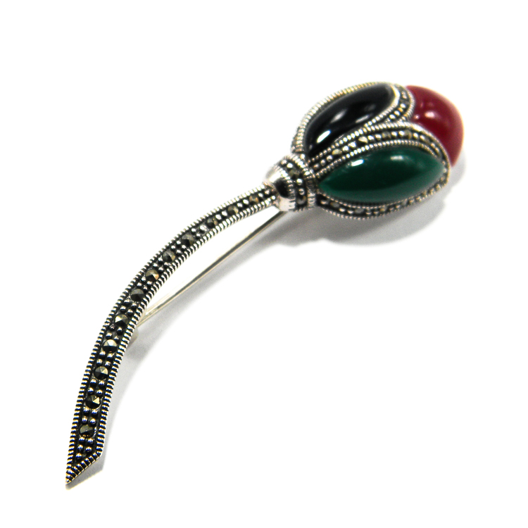Brosa din argint 925, in forma de lalea, decorata cu marcasite si pietre semipretioase: jad verde, carneol si onix.