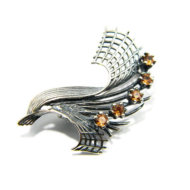 Broșă vintage din argint cu zirconiu galben, model floral stilizat, cu discrete influențe Art Nouveu. Este realizată din argint patinat și decorată cu cinci pietre strălucitoare de zirconiu galben, de 4 mm. Aspectul său filigranat îi congeră rafinament și o notă poetică. O bijuterie elegantă, ce poate fi un dar potrivit pentru iubitoarele stilului vintage.