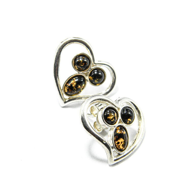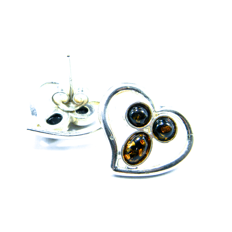 Cercei din argint 925, in forma de inimioare, decorati cu chihlimbar verde.
