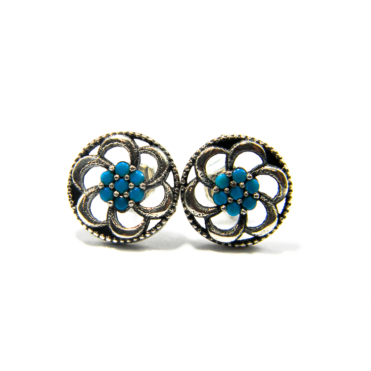 Cercei mici, pe lobul urechii, din argint 925, in forma de floare. Sunt decorati cu pietre de turcoaz albastru.