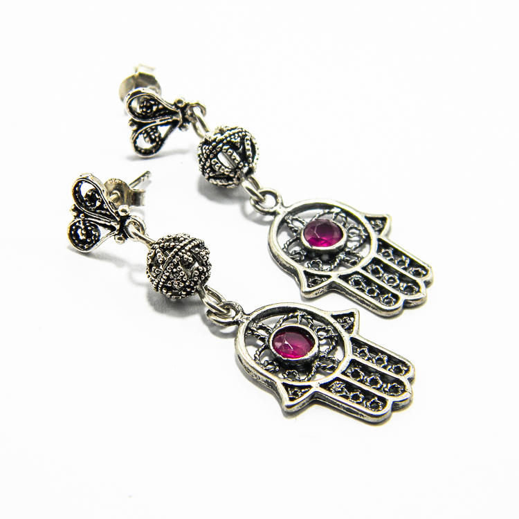 Cercei handmade unicat din argint cu rubin – Hamsa – Mana Fatimei – HM0555AX