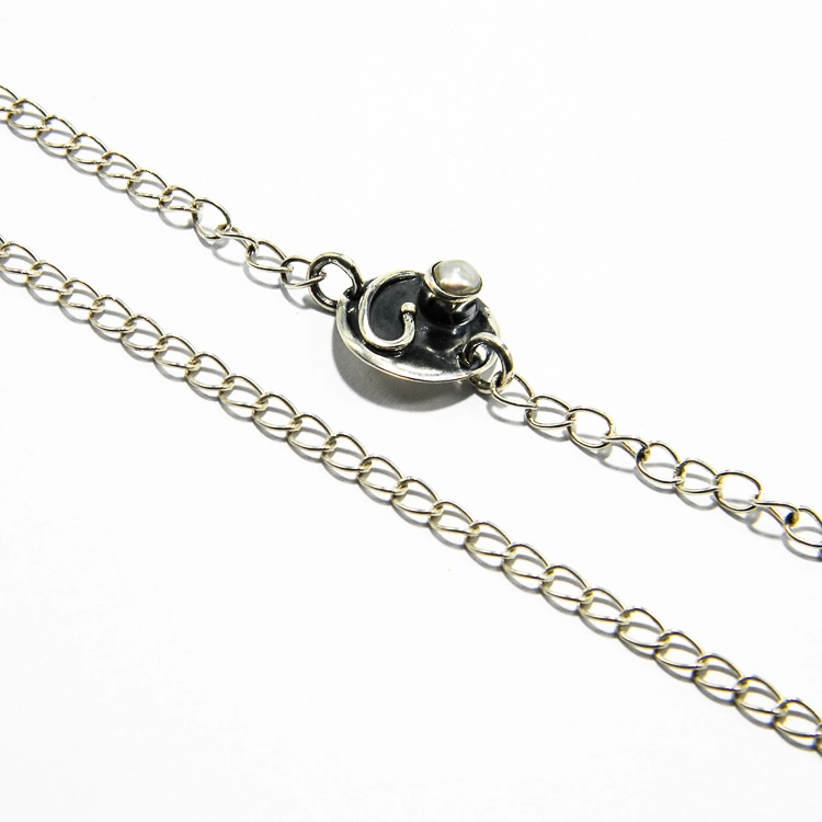 Colier din argint cu jad verde și perlă – bijuterie de autor, piesă unicat, stil fashion contemporan. Designul este centrat pe pandantivul în formă de inimă, decorat cu un super jad verde. Un alt pandant rotund din argint antichizat, decorat cu perlă de cultură, crează nota de asimetrie caracteristică stilului contemporan. Cele două elemente sunt susținute de segmente de lant cu zale ovale. O bijuterie modernă și elegantă, ideală pentru iubitoarele bijuteriilor cu aspect nonconformist.