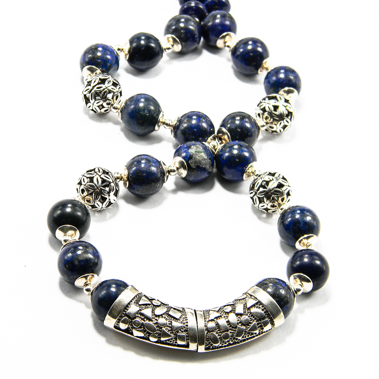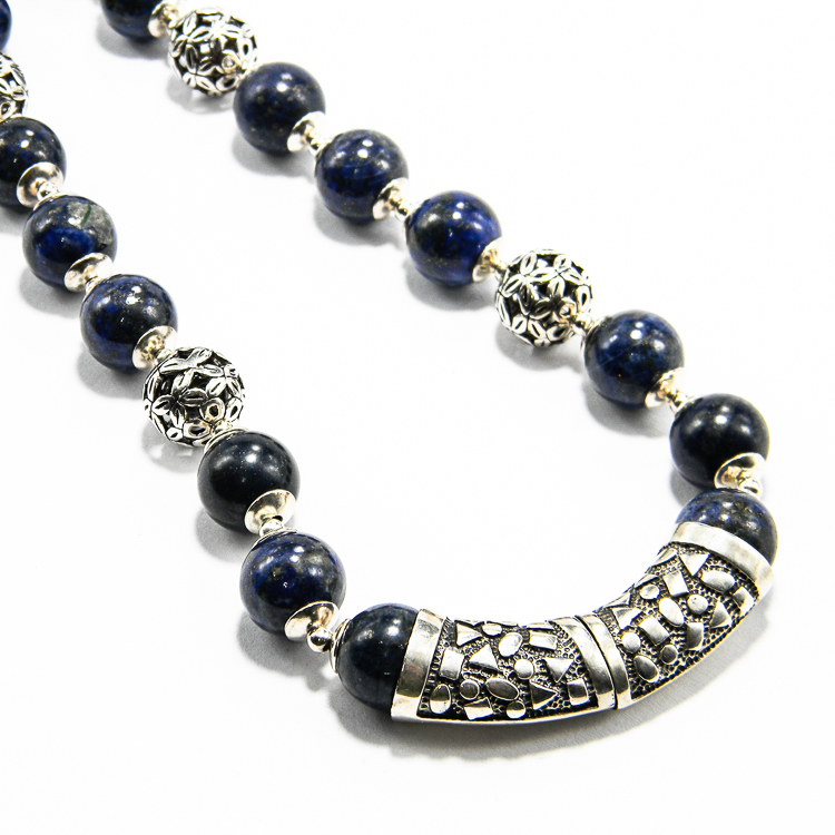 Colier statement unicat realizat manual din componente de argint 925 (element central, bile mari, furnituri si inchizatoare) si pietre de lapis lazuli natural, lucrat in caboson (rotunde la mijloc, rondele in partile laterale).