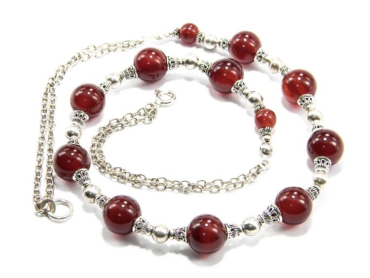 Colier handmade unicat, in stil vintage, realizat din pietre de carneol natural in caboson, si componente de argint 925: segmente de lant dispuse pe doua randuri, bile din argint de 3 mm., furnituri si inchizatoare.
