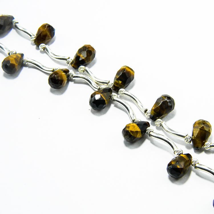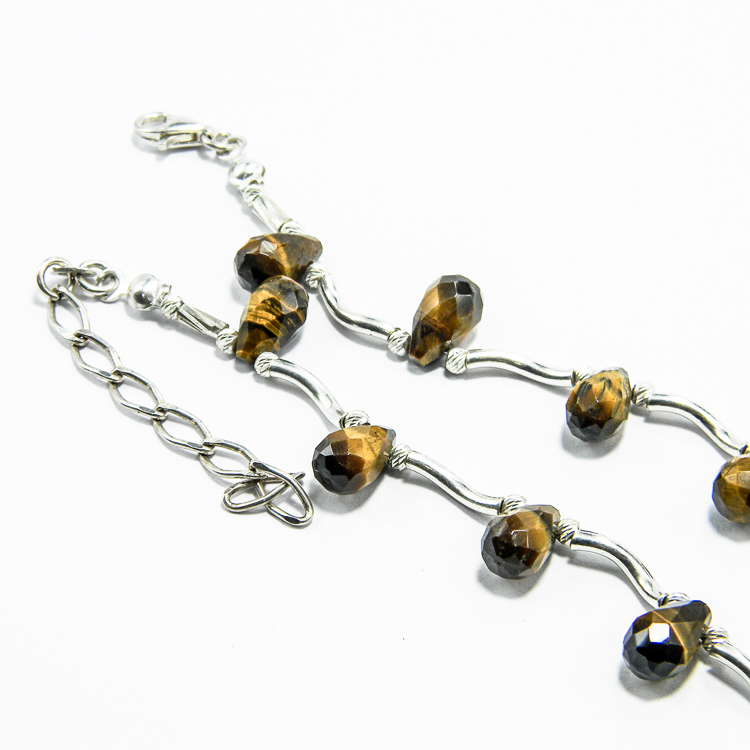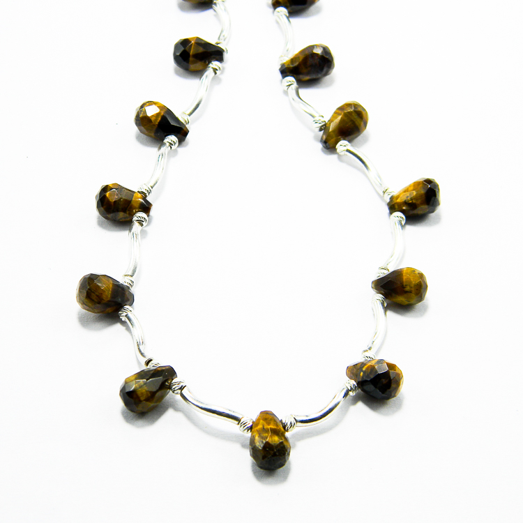 Colier handmade unicat, realizat din pietre fatetate de ochi de tigru, in forma de lacrima, si componente de argint 925 (tije ondulate, bile mici fatetate, furnituri si inchizatoare).