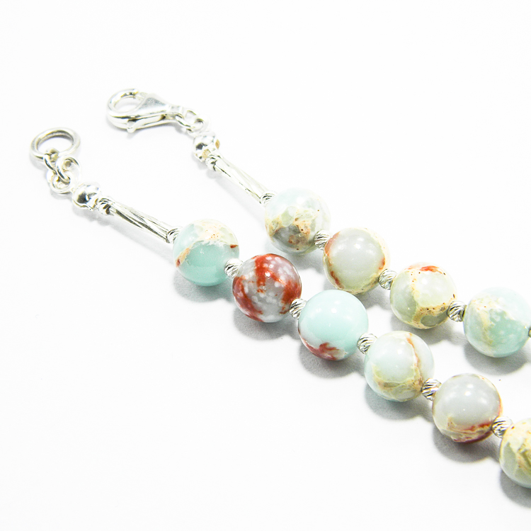 Colier unicat handmade, realizat din pietre de amazonit cu incluziuni, si compomente din argint 925 (bile fatetate de 1 mm., furnituri si inchizatoroare).