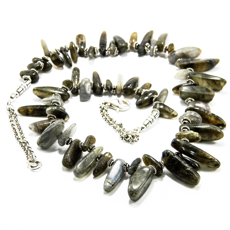 Colier realizat din pietre naturale neregulate de labradorit, in forma de ace, si componente din argint 925 patinat.