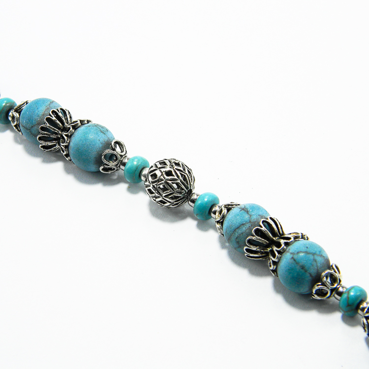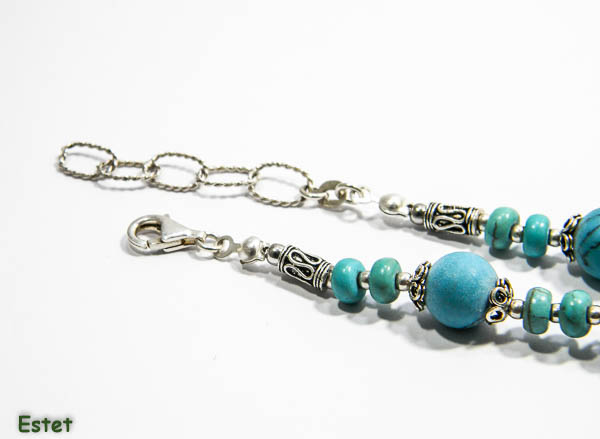 Colier unicat handmade, realizat in stil oriental din componente de argint 925 antichizat si bogat ornamentet cu pietre de turcoaz natural.