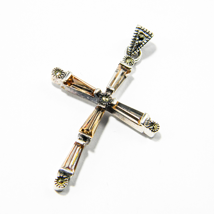Pandantiv cruciulita vintage din argint 925, decorat cu cristale de topaz galben si marcasite.