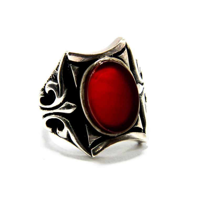 Inel barbatesc, in stil bizantin, din argint 925 antichizat, decorat cu piatra de carneol.