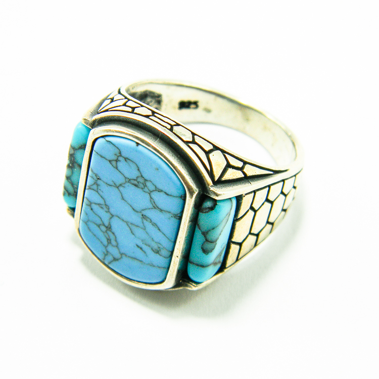 Inel barbatesc din argint 925, lucrat in stil Art Deco. si decorat cu pietre howlit albastru.