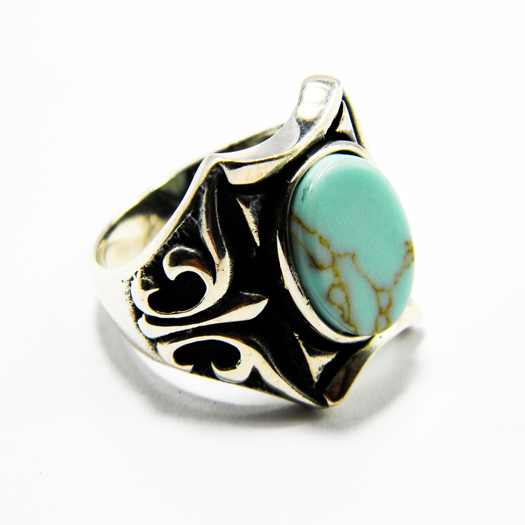 Inel barbatesc, model bizantin, din argint 925 antichizat, decorat cu piatra de turcoaz.