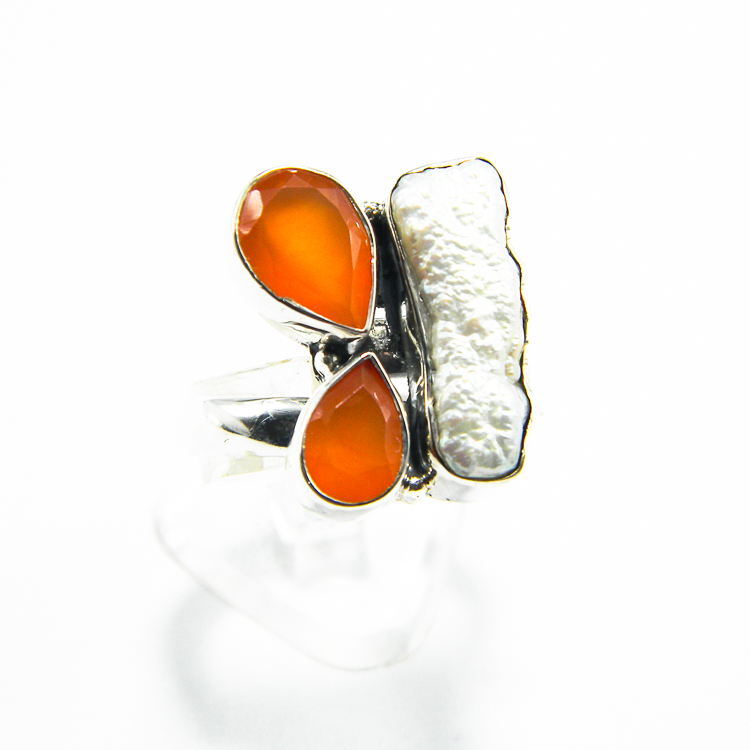Inel reglabil, model unicat, din argint 925, decorat cu perle Baroc de culoare alba, in forme neregulate, si pietre de carneol.
