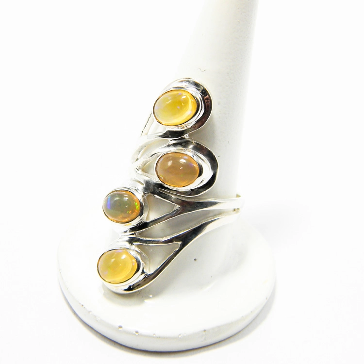 Inel lung din argint cu opal de Etiopia, o bijuterie contemporană elegantă, cu formă alungită și aspect aerisit. Este decorat cu 4 pietre naturale de opal etiopian în cabochon, de aproximativ 6 mm. Fiecare piatră se remarcă prin culorile sale fascinante, cu irizații subtile de auriu și verde crud.