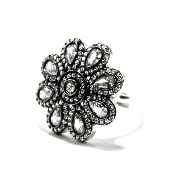 Inel reglabil, in forma de floare, din argint 925 antichizat, decorat cu pietre zirconiu si cristale albe – stil oriental.