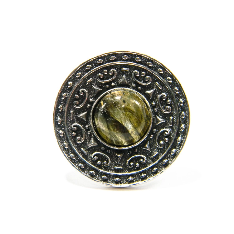 Inel unicat din argint cu labradorit, în stil vintage bizantin, cu mărime reglabilă generoasă. Aspectrul compact, dens, al acestei bijuterii statement este pus în valoare de piatra naturală în cabochon, cu diametru de 1.2 cm. Gravura cercului din argint antichizat, cu elemente bizantine discrete, conferă piesei un aspect sobru, imperial.