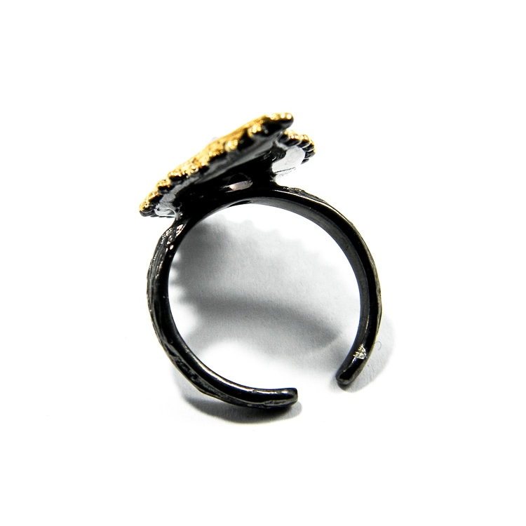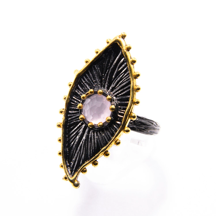 Inel vintage din argint cu cuarț roz și broderie aurie, bijuterie artizanală de autor, cu influențe Art Nouveau. Inelul are un aspect de floare stilizată, cu finisaje atente și contrast plăcut. O bijuterie statement ideală pentru iubitoarele stilului boem.