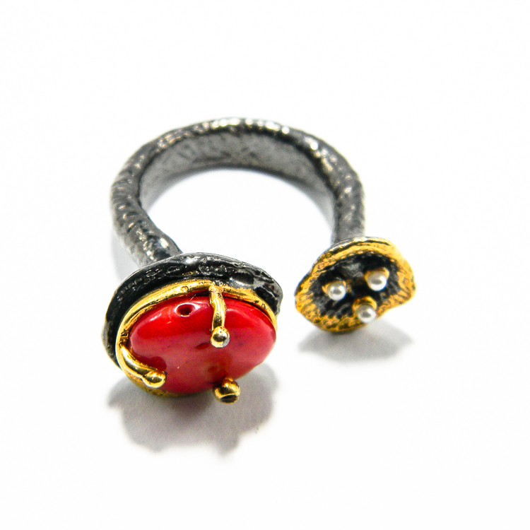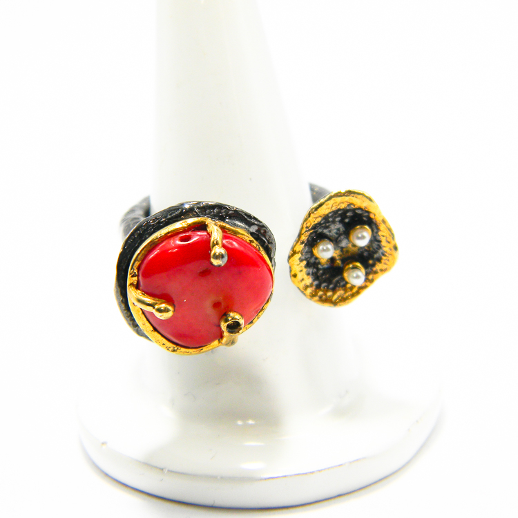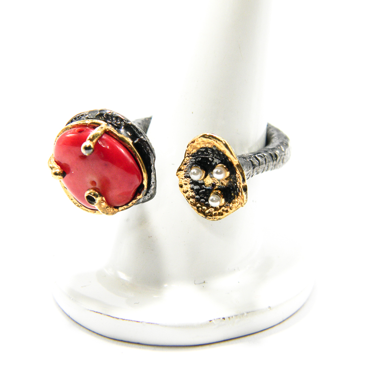 Inel vintage statement din argint cu coral si perla – Handmade Unicat – i210F2G