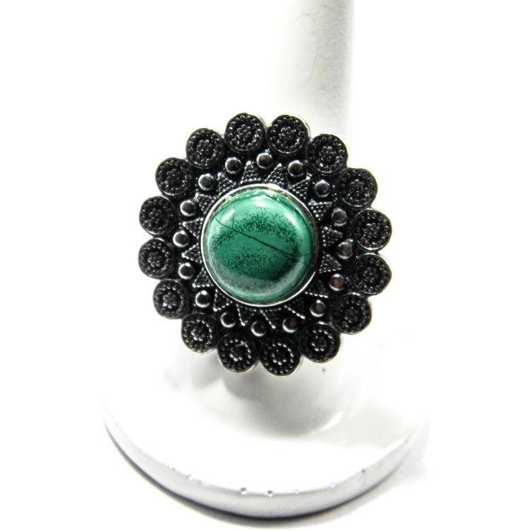 Inel vintage din argint cu malachit, unicat, reglabil – mărimea 51 -60 – inel statement din argint antichizat, piesa etno care îmbină atît stilul Art Nouveau, cât și stilul oriental. Este decorat cu piatră mare (10 mm.) de malachit în caboșon.