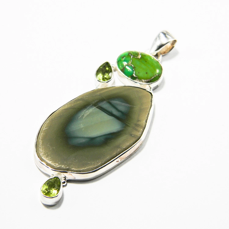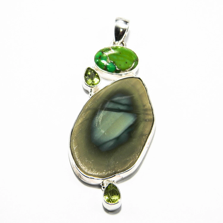 Pandantiv din argint cu jasp imperial și turcoaz verde, bijuterie contemporană de autor. Elementul central al acestei piese statement constă în piatra mare de jasp imperial, de aproximativ 3.5 x 2 cm, decorată cu turcoaz verde ( turcoaz african) de 1 x 1.5 cm. Pietrele mici de olivină fațetată, în formă de lacrimă (cca. 7 mm) adaugă un plus de lumină acestei compoziții moderne. O bijuterie fashion în stil avangardist elegantă, unde nuanțele puternice de verde crud se combină armonios cu tonurile de toamnă ale jaspului imperial.