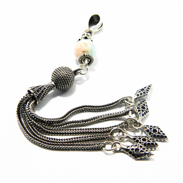 Pandantiv lung din argint 925 patinat si piatra de amazonit, model unicat, in forma de ciucure – stil vintage oriental – handmade.