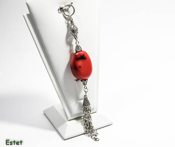Pandantiv lung realizat manual, in stil vintage, din componente de argint 925 antichizat, si coral rosu natural.