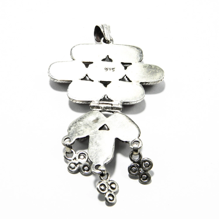 Pandantiv statement din argint cu coral natural, piesă masivă (22–24 g). Are un design caracteristic zonei, iar baza din argint patinat este decorată cu coral oval și ciucuri mici din argint. Pandantivul este prevăzut cu un mecanism articulat, care îi permite să se miște, accentuând aspectul etno al întregii compoziții. O bijuterie unicat în stil vintage, de colecție sau un cadou deosebit pentru cei care iubesc cultura și tradițiile asiatice.