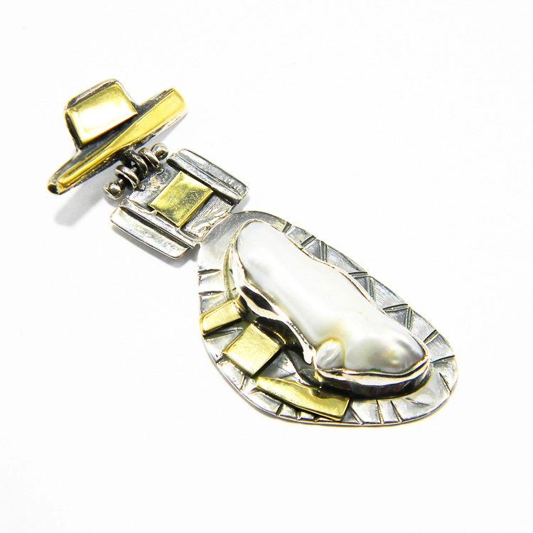 Pandantiv unicat din argint cu perlă Baroc, cu baza din argint 925 și elemmente din argint aurit. Bijuteria are un aspect modern, dar și influențe ale stilului Art Deco târziu, vizibile mai ales în liniile geometrice ale argintului aurit. Este prevăzută cu anou discret ( 5 mm), cu aspect de pălărie stilitată.