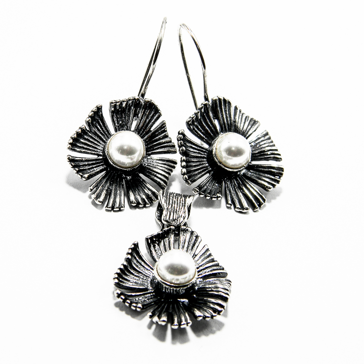 Bijuterii Unicat – Set argint unicat din argint 925 si email, cu motive florate, format din cercei si pandantiv.
