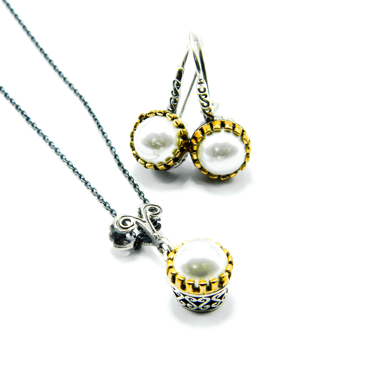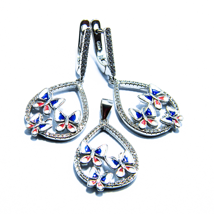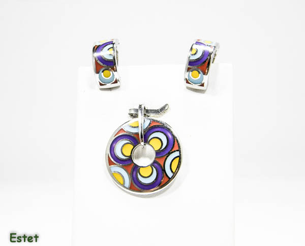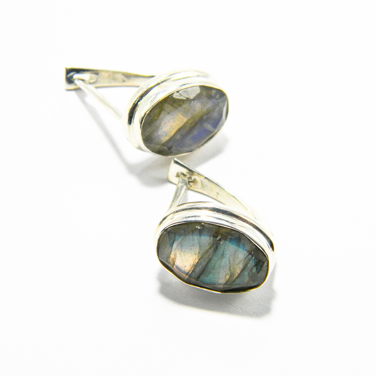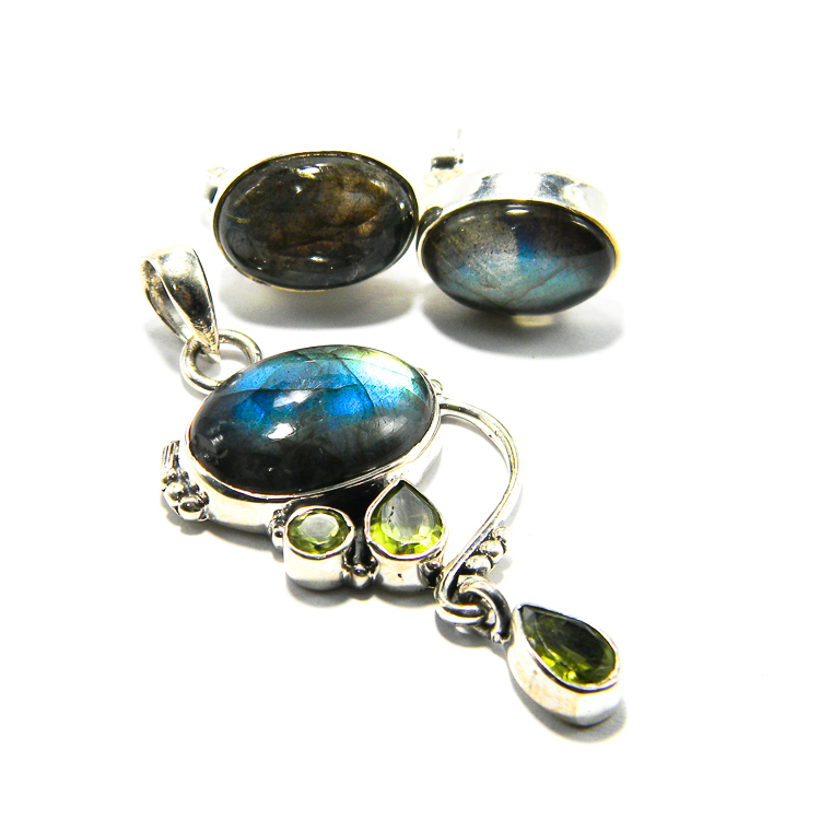 Set in stil fashion din argint 925 (cercei si pandantiv), decorat cu pietre naturale de labradorit fatetat.