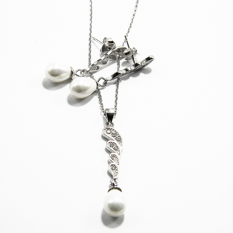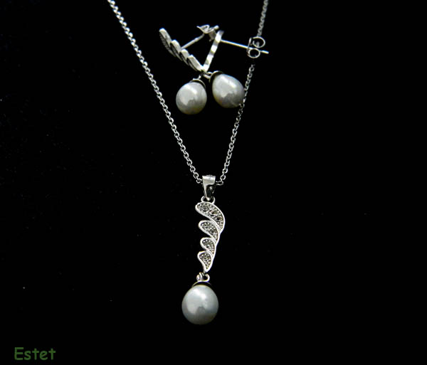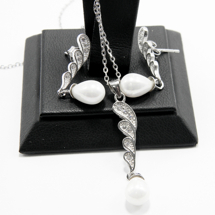 Set – colier si cercei – din argint 925, perle albe artificiale in forma de lacrima, decorat cu pietre zirconiu.