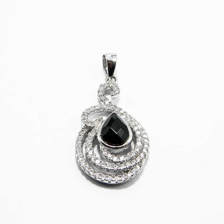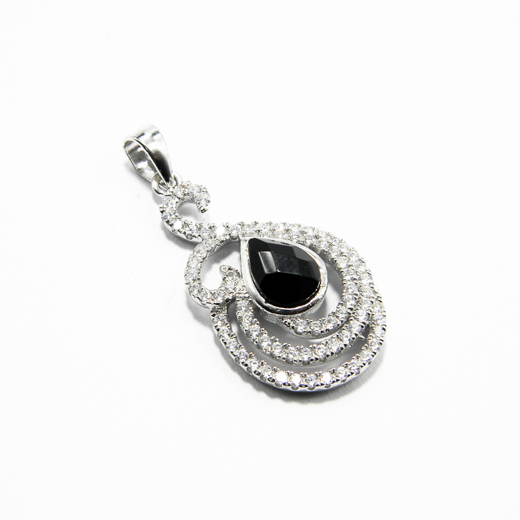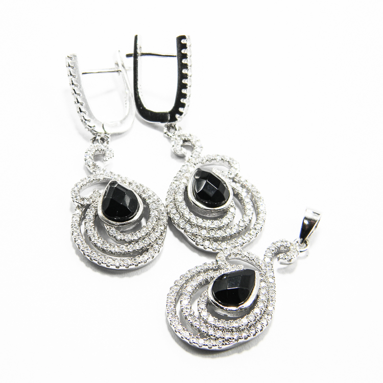 Set fashion din argint 925 – cercei si pandantiv – decorat cu pietre negre in forma de lacrima, si pietre zirconia de culoare alba.