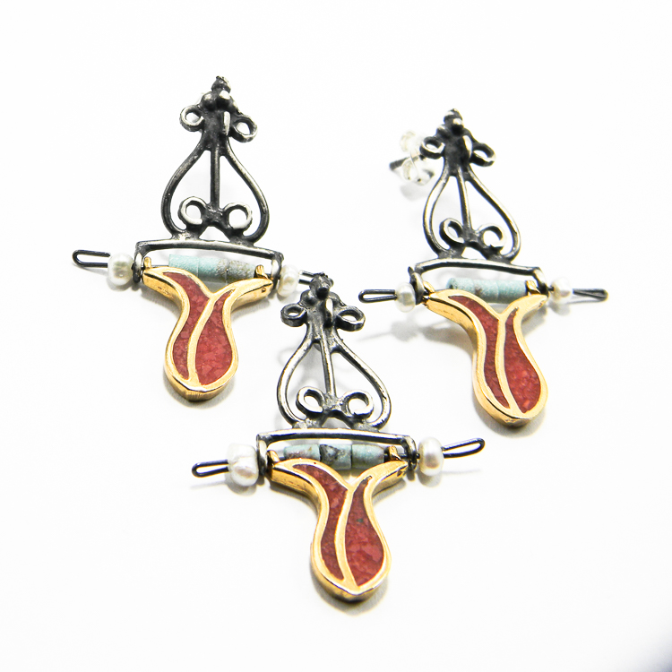 Set vintage unicat – cercei si pandantiv – cu motive florale, realizat din argint 925, in stil oriental.