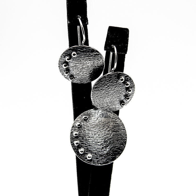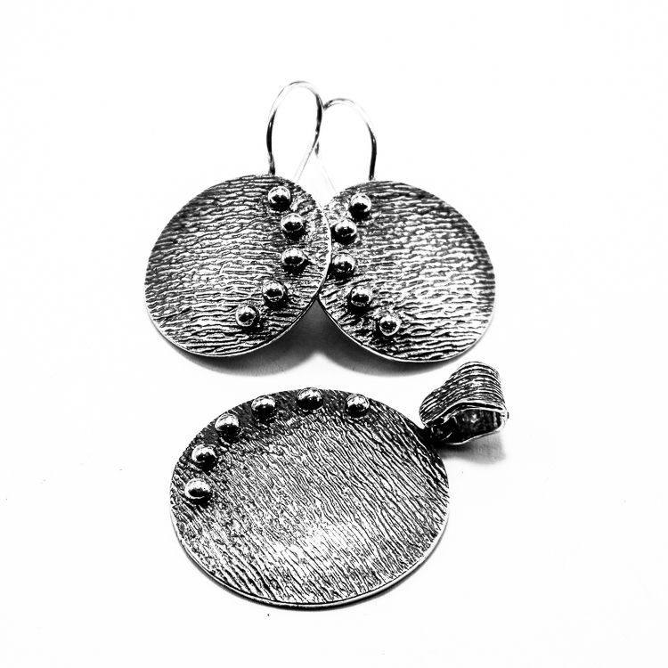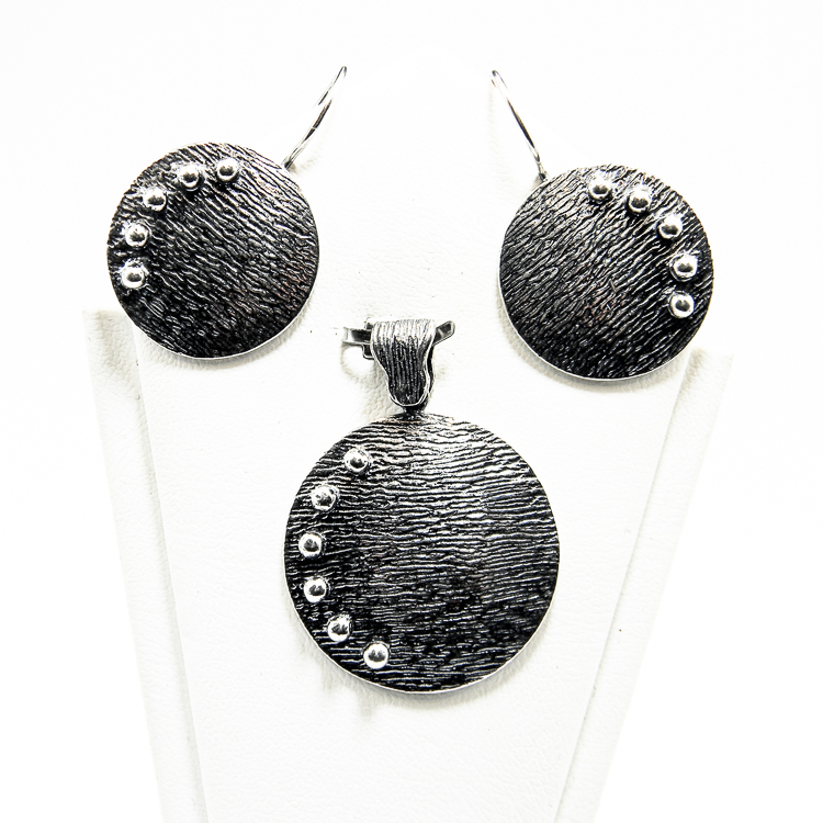 Set vintage in stil Art Deco din argint 925 patinat, format din cercei si pandantiv, cu elemente in forma de cercuri.